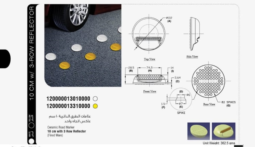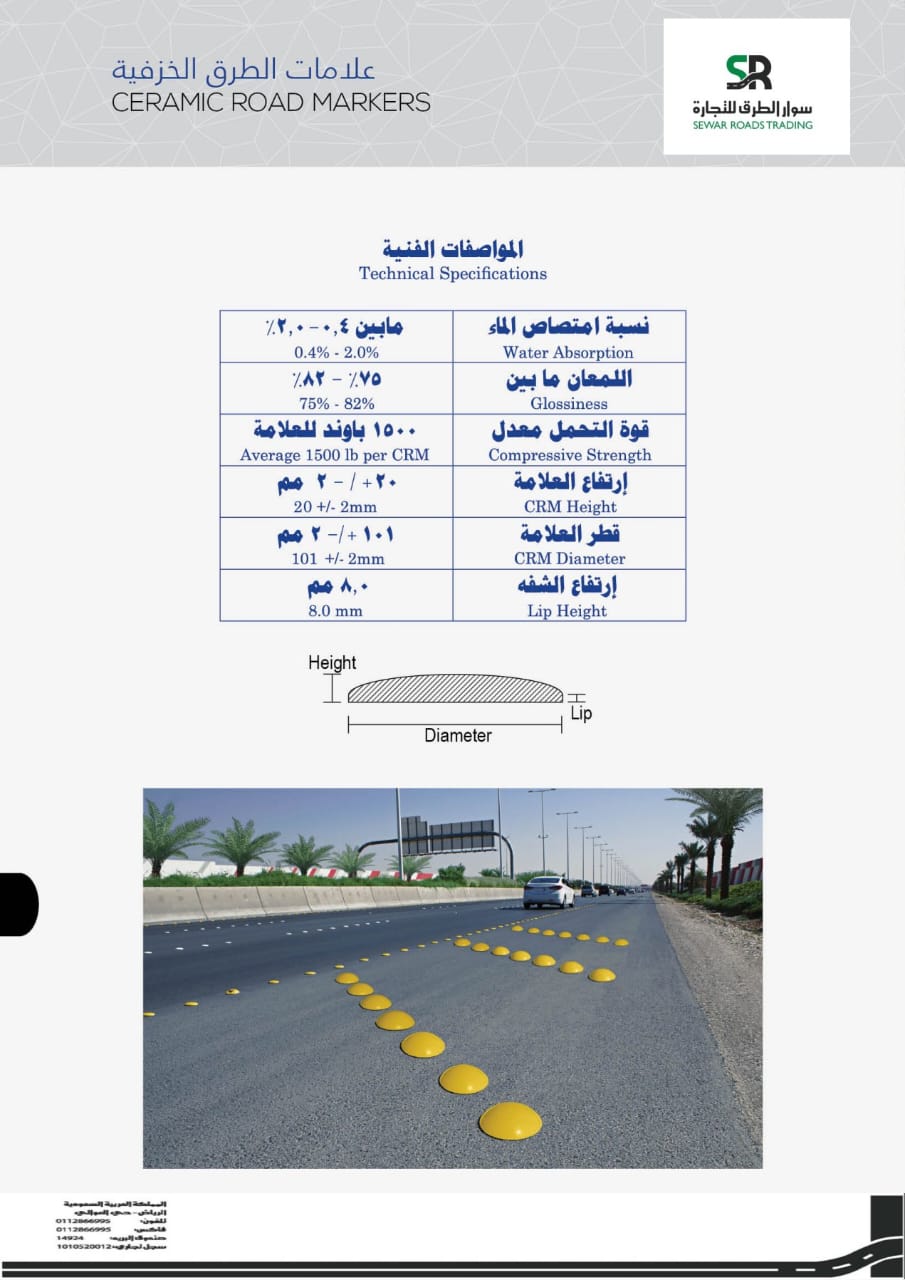 Sewar Roads provides Ceramic road studs that are made from the best Ceramic materials that are of high resistance, and they are known to be of high quality and have tremendous capacity to endure heavy loads and high temperatures ,These products are approved by regulatory bodies and corporations responsible for the execution of projects